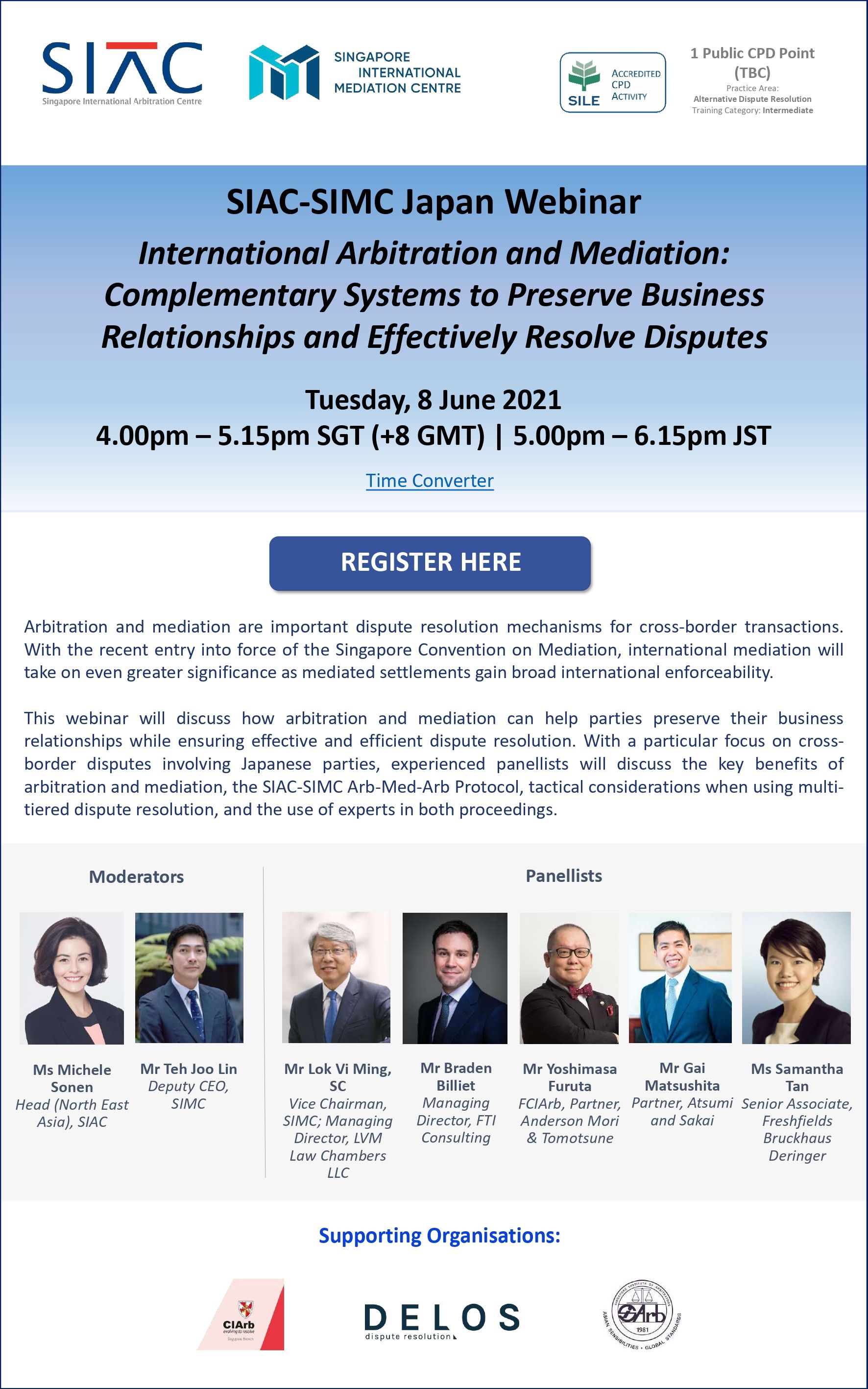 SIAC-SIMC Japan Webinar International Arbitration and Mediation: Complementary Systems to Preserve Business Relationships and Effectively Resolve Disputes (8 June 2021)